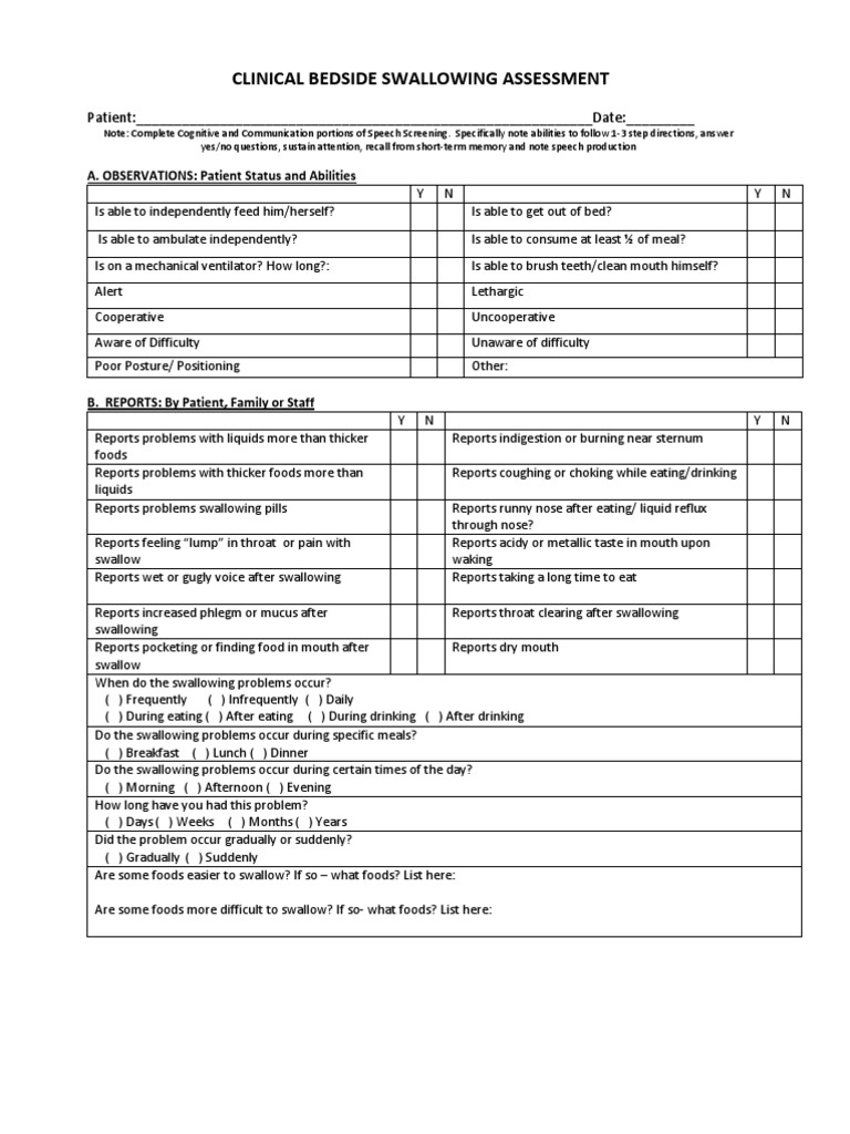 Web are you considering to get bedside swallow evaluation pdf to fill? Web adult clinical swallowing evaluation template name: Cocodoc is the best spot for you to go, offering you a convenient and customizable version of bedside. Upload, modify or create forms. Web the slp may ask them about what foods you find hard to swallow and what foods you.