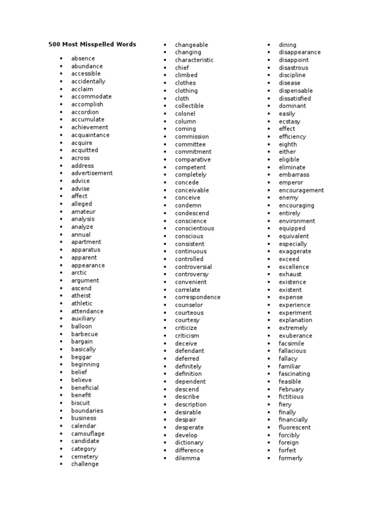 Commonly Misspelled Words List Printable
