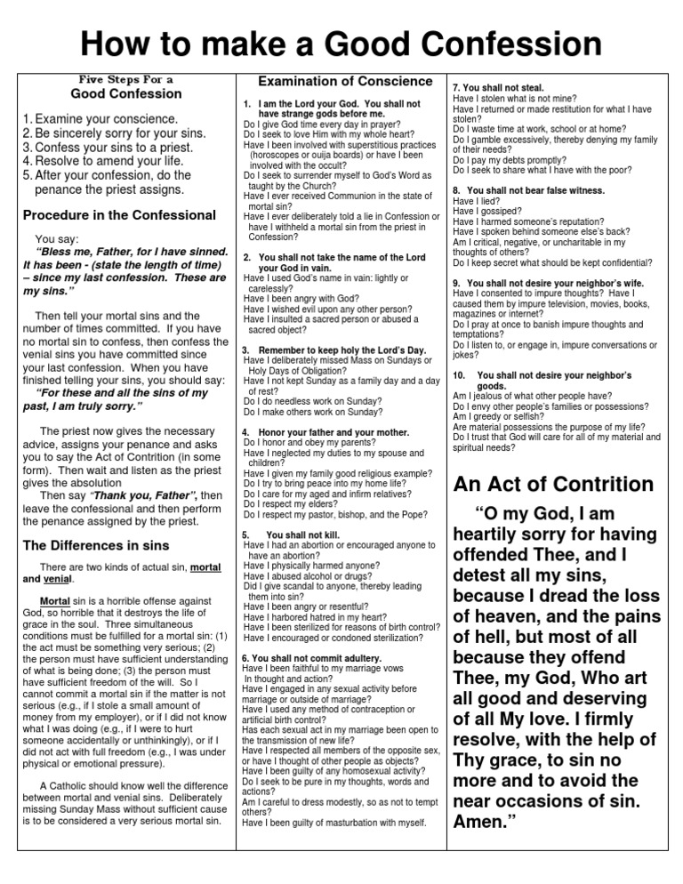 Confession Cheat Sheet - Prepare for confession before going to confession, do an examination of conscience to reflect on what sins you.