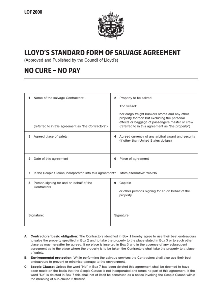 It consistently aims to reflect best practise in light of changing circumstances. Benefits review the effectiveness of the lloyd’s open form of salvage agreement. Originating in the late 19th century, the form is published by lloyd's of london and is the most commonly used form for international salvage. Name of the salvage contractors: