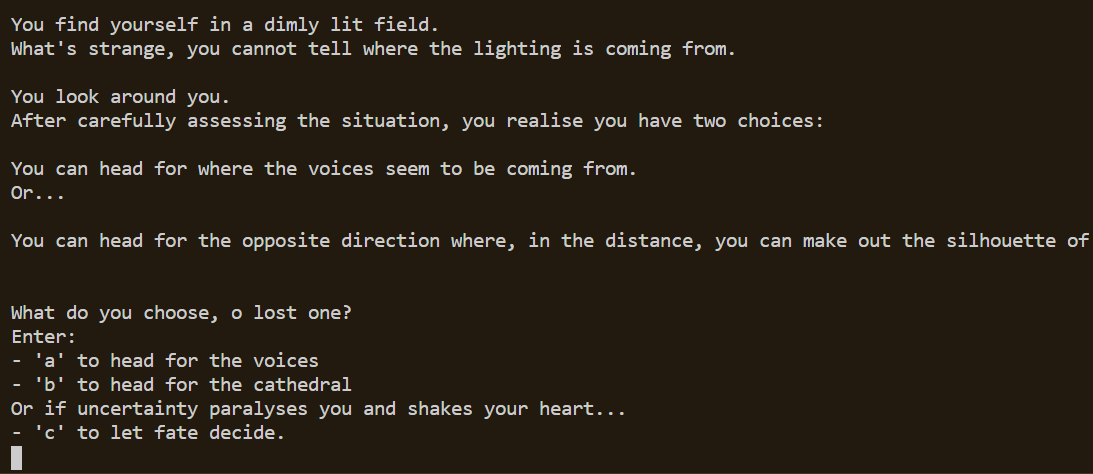 Rooms = { 'front lobby': Triet228 / text adventure dungeon game.py last active 5 months ago star 2. Aditya binukumar srishti sharma shiva tripathi tanishq tanwar. This one has a battle system, a shop, a save. A python script to use openai's.