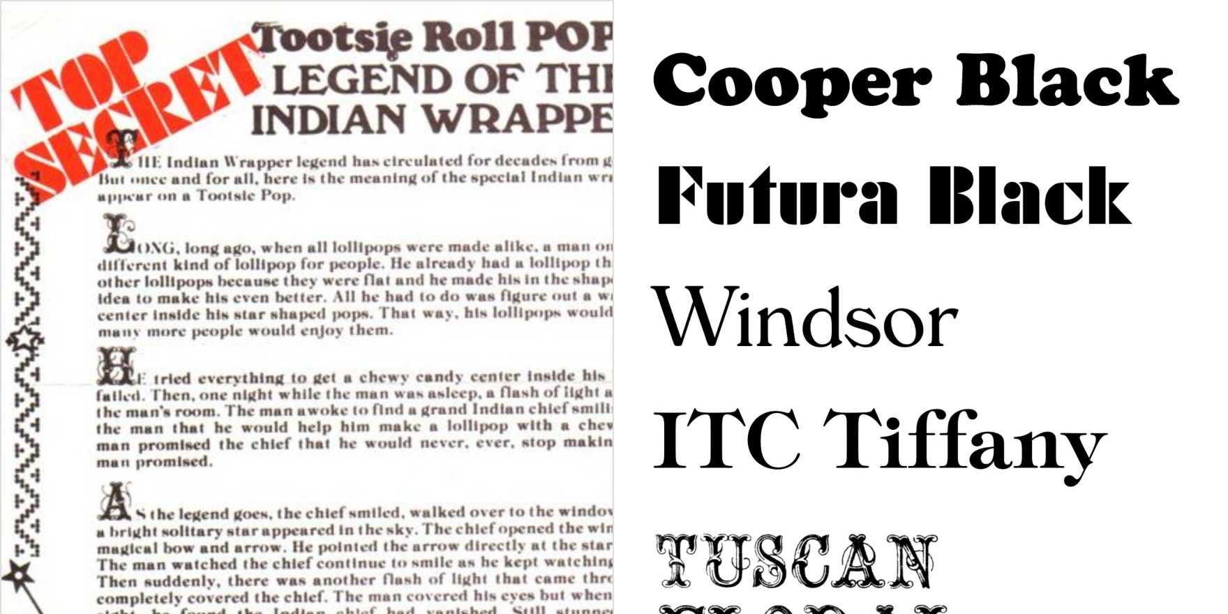 Tootsie Roll Pops “Legend of the Indian Wrapper” Fonts In Use